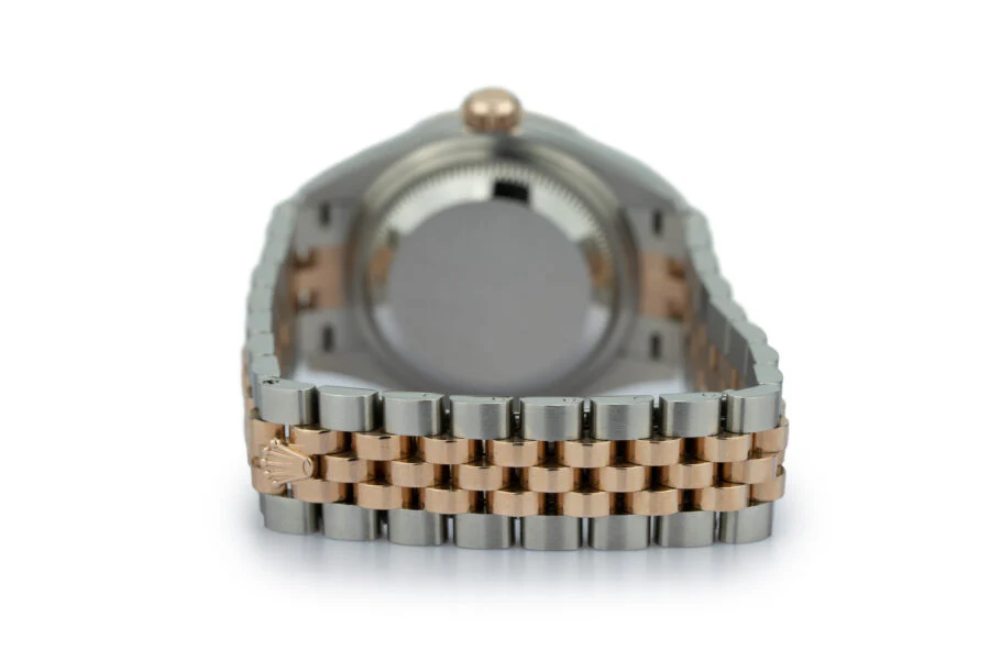 The Rolex lady-datejust 28mm (2022) Ref279171 with green diamond dial with aesthetic fluted bezel is the choice for many. This preloved Everose Rolesor is a combination of gold and steel. This mix adds both a sense of luxury and durability to the material. It has a crystal cyclops lens that is known for scratch resistance. This watch comes in a Jubilee bracelet that has five-piece links. It comes in a full set.